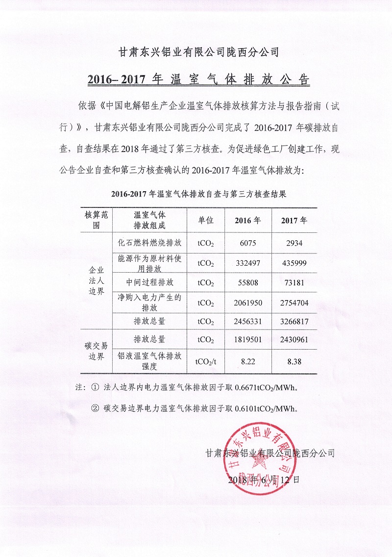 關于甘肅東興鋁業(yè)有限公司隴西分公司2016-2017年溫室氣體排放公告公示