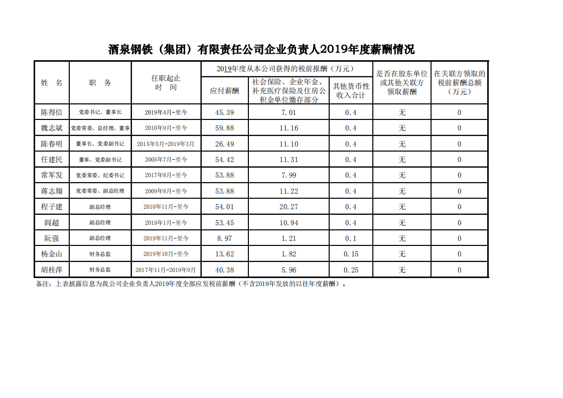 酒泉鋼鐵(集團)有限責任公司企業(yè)負責人2019年度薪酬情況