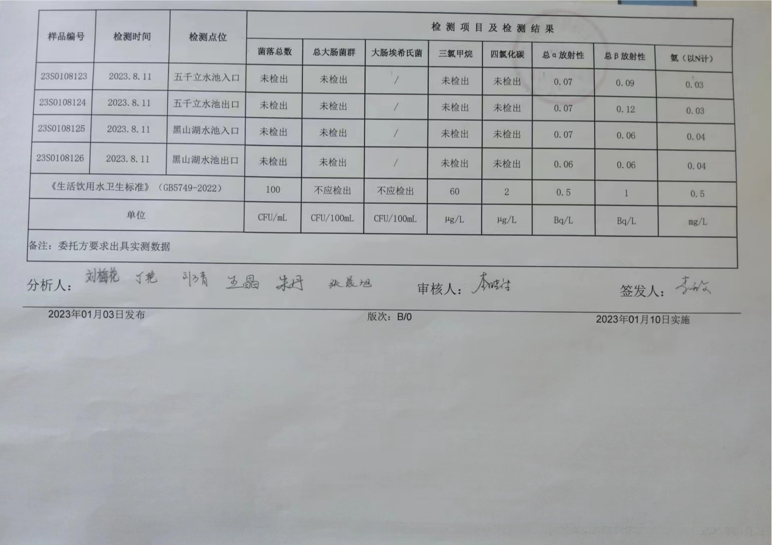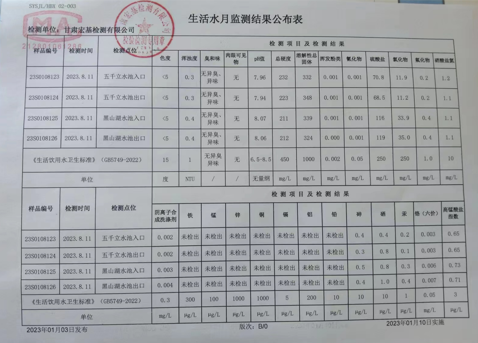 甘肅潤源環(huán)境資源科技有限公司水源地水質(zhì)2023年第三季度公示